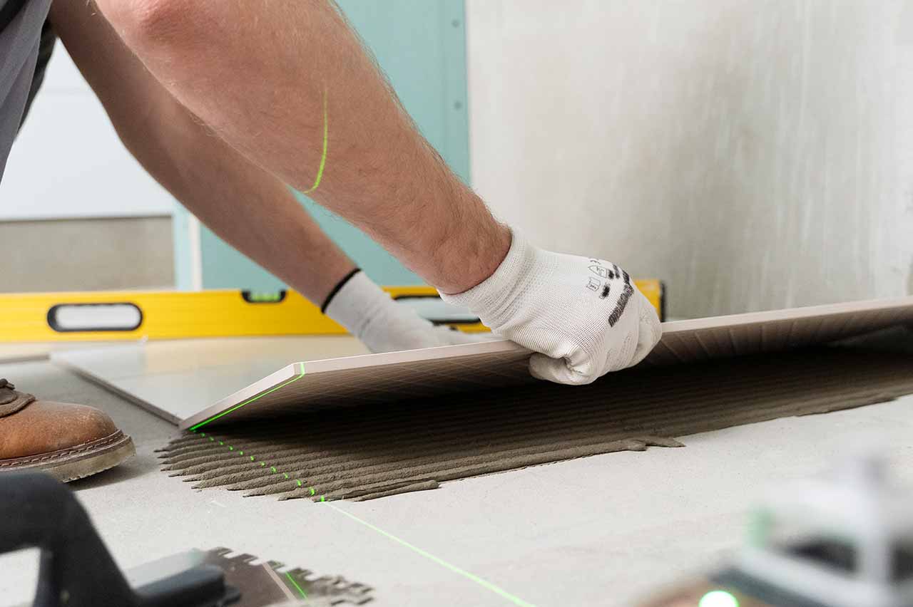 Präzise Handwerksarbeit bei der Verlegung von Fliesen.